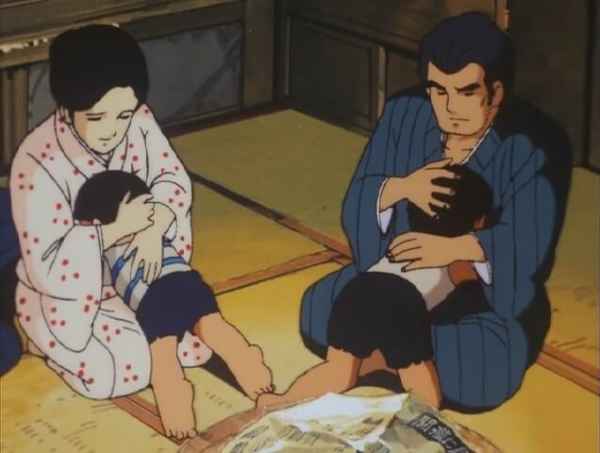 In the days leading up to the bombing, we follow Gen and his family as they try to survive during the war, always watching the sky in anticipation of an attack. Bombers fly over and everyone hides until the noise has passed. We see the excitement of the Mom expecting a baby. Dad working in a wheat field. Gen and his brother running and playing.