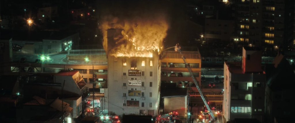 In the opening moments of the film we see a building on fire. Firetrucks roar down the road busy with pedestrians and children racing on their bikes to get a closer look. Gentle piano music begins to play behind wider shots of the city, the building fully ablaze. The sounds of impending doom? A natural destructive event heralding change and rebirth? The stage is set.