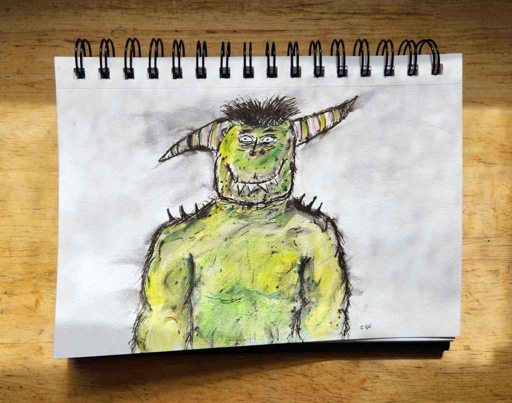 On this little, green Orc ink and watercolor I learned that all ink’s are not created equal. I messed up the eyes and the mouth at first. The ink ran when I used watercolor. I went back to my new favorite trick and drew new eyes and teeth, inked them, cut them out, and pasted them on. I also let fear get the best of me. Once I got Marlowe to a place I was happy with, I wondered if I should draw a background. Place him somewhere. I chickened out this time, but that’s okay.