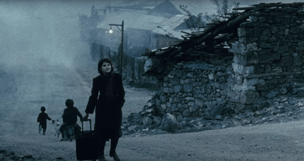 The cinematography by Maxim Drozdov is otherworldly. I felt transported. The film uses deep blues, greens, and browns to give everything a sort of faded memory feeling. It’s dark and rich and earthy. It’s full of a long shots filled with misty mountains, dark tunnels, flocks of blackbirds, and crumbling stone villages.