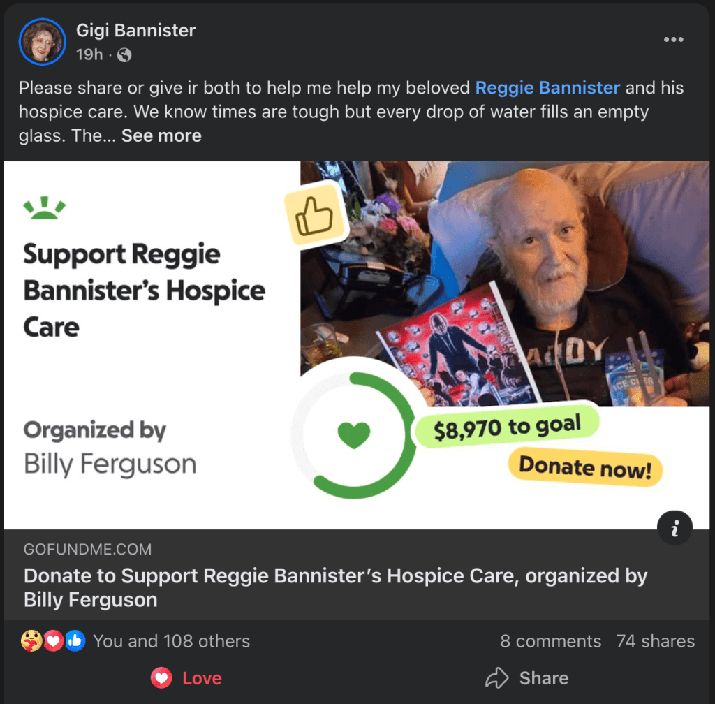 Alongside his devoted wife Gigi, Reggie spent many weekends traveling to comic and horror conventions, meeting fans, signing autographs, and sharing his passion for entertainment. This has been their source of income for many years. Reggie’s health has taken a turn now he’s facing the challenges of Lewy Body dementia and Parkinson’s disease, which have led to his move into in-home hospice care.